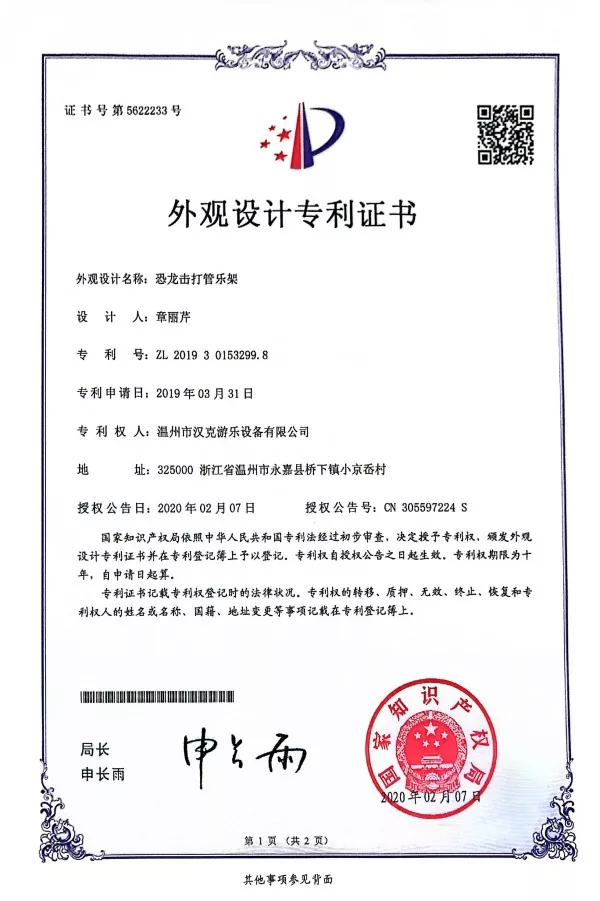 د ډیناسور په شکل د پرکوشن اندازه 120 * 55 * 140 سانتي متره ده، د مصر المونیم + شیشې فایبر تقویه شوي پلاستیک سره + د ګالوانیز پایپ څخه جوړ شوی. د دې ټول رنګ شنه دی، د بدن په منځ کې د مختلفو رنګونو اته المونیم ټیوبونه لري. د هغه د پښو لاندې دوه ژیړ الکترون شتون لري چې د هغه بدن ملاتړ کوي. په سر او غاړه کې ډیری ژیړ سینګارونه شتون لري چې د ډیناسور ځانګړتیاوې په ګوته کوي.