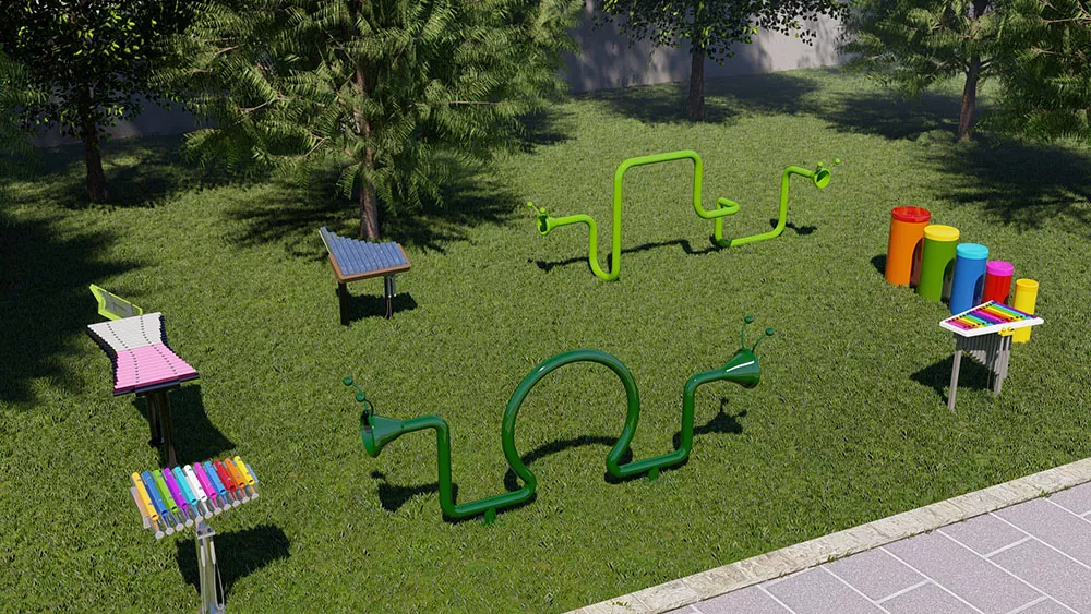د بیروني میوزیک لوبې ډګر تجهیزات رینبو کیبورډ د کور دننه او بهر د لوبو ډګرونو ، د ښوونځي لوبو ډګرونو ، یا د وړکتون لوبو ساحو کې د خالي دیوالونو سره کارول کیدی شي. نور بیروني پرکوشن وسایل هم په ترکیب کې کارول کیدی شي.
